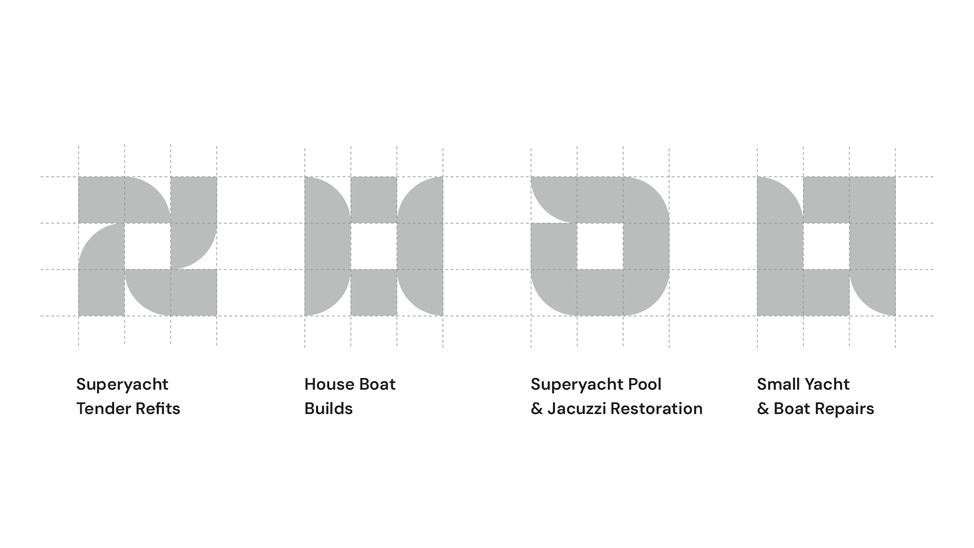 We created a unique set of icons, derived from the logo design, to represent the company’s core services: superyacht tender refits, house boat builds, small yacht and boat repairs, and superyacht pool and jacuzzi restorations. These icons are used across the website and on printed material to help identify the service, as well as enhance the brand’s visual identity, adding a bold and cohesive graphic element.